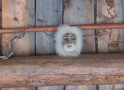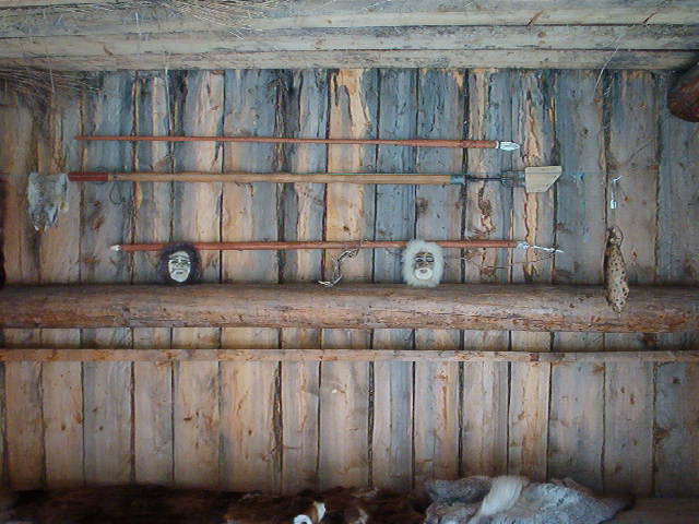 Our first stop was the Alaska Native Heritage Center, which is a 26-acre campus with interpretive displays to explore the traditional ways of five distinct Alaskan Native cultures. Each of the five cultures had a traditional home set up with displays of tools and clothing. Here's the interior of one of the homes.