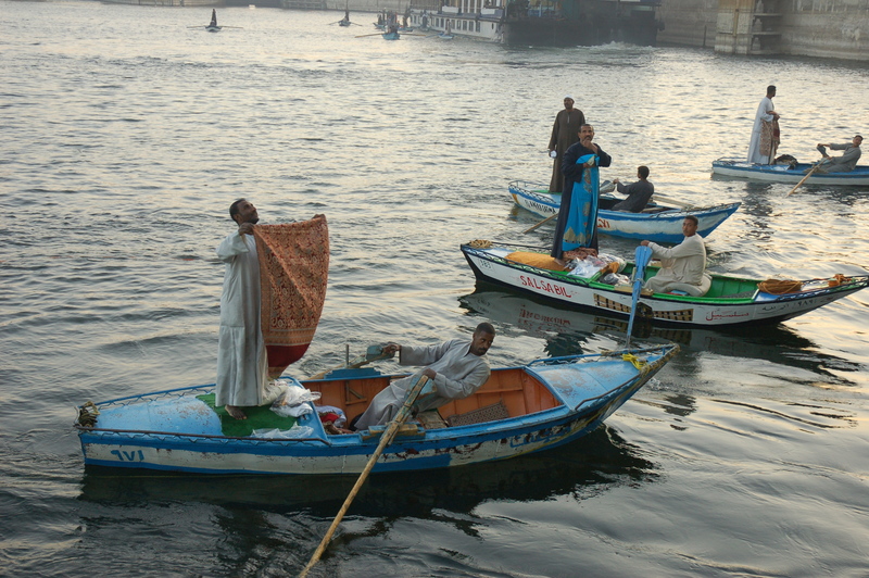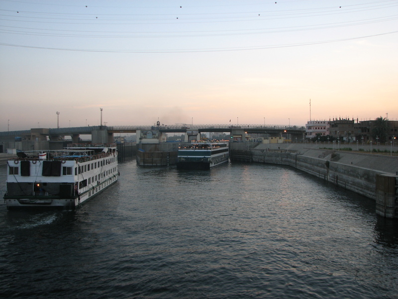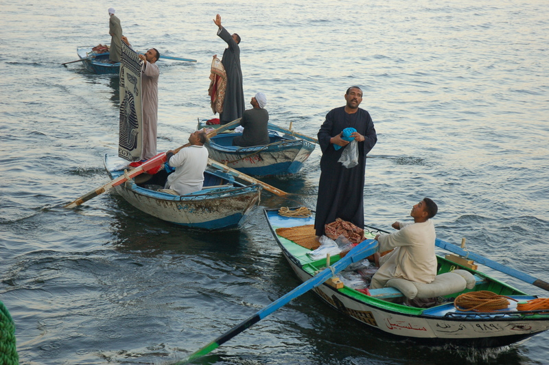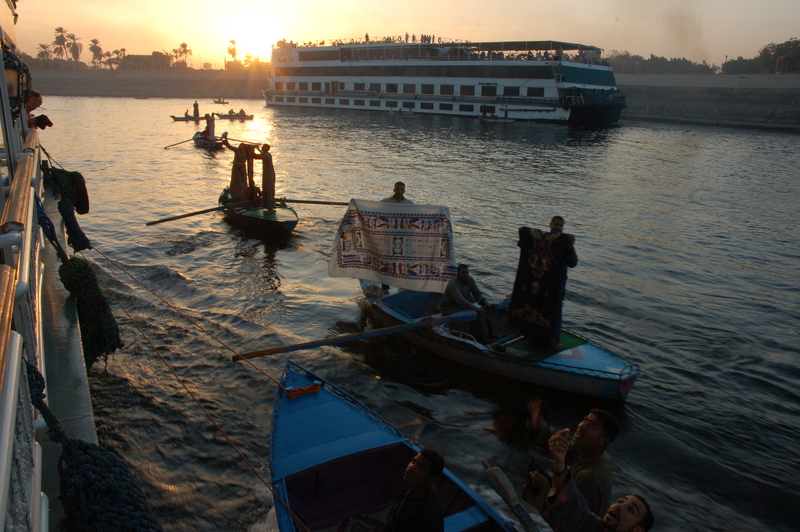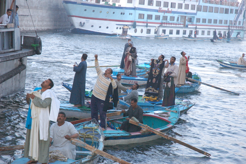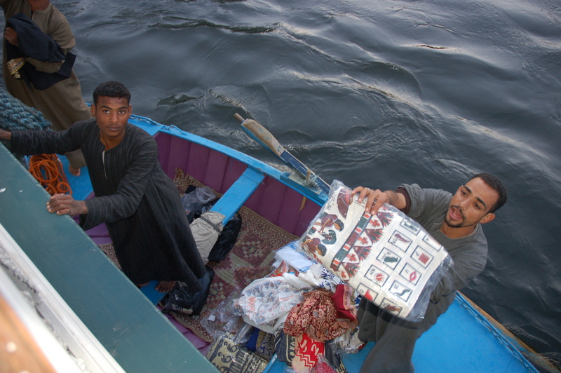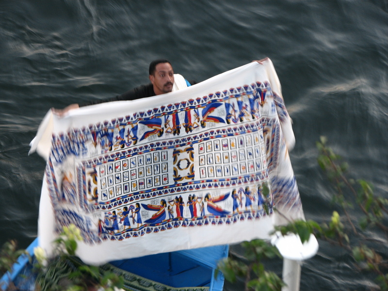 We were at lunch when we approached the lock at Esna. Suddenly a small boat crashed into ours. Was it an accident? Pirates? No, it was more of those pesky vendors. While boats are waiting their turn at the lock, they are a captive audience. The vendors throw towels, t-shirts and gowns up to the deck of the boat. If someone wants an item, they yell back and forth to negotiate a price and throw the money back down. If nobody wants the item, someone throws the item back down. Some people were even asking for different colors and sizes, and merchandise was flying back and forth for a while before we entered the lock.