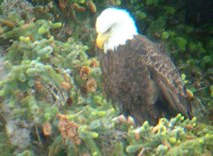 Then we started seeing flying and nesting bald eagles everywhere we looked. The salmon would soon start spawning up the river and the eagles had a front row seat. The really cool thing about having a digital camera is that I was able to put the lens of the camera up to the eyepiece of a spotting scope, and sight in on the image. I took this shot of a nesting eagle.
