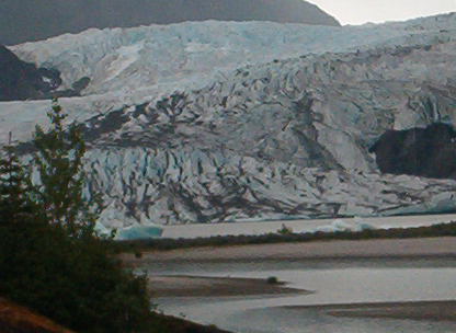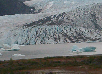These are magnified pictures of the glacier taken by putting the lens of the digital camera up to a telescope. The glacier appears dirty because of all the rock it has ground up.