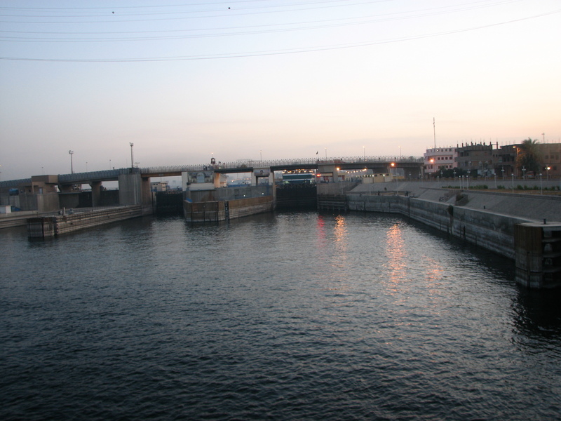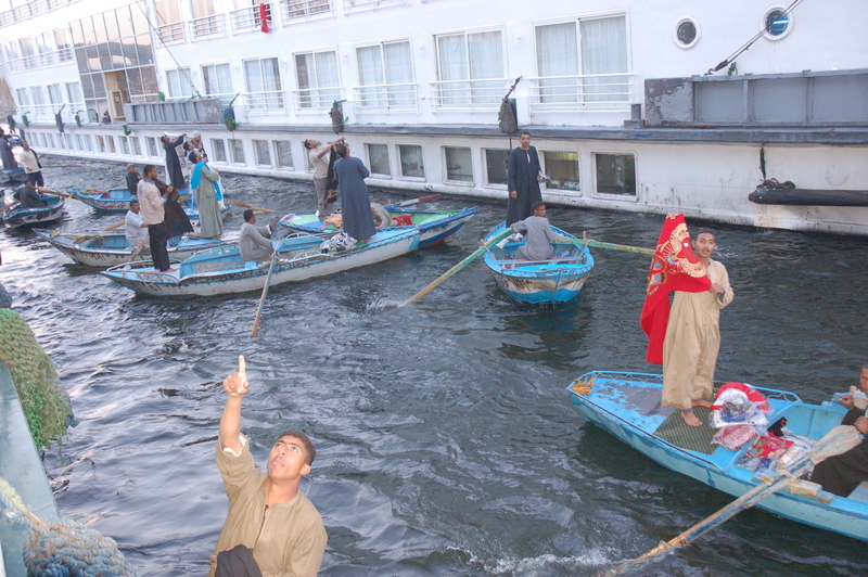 We were at lunch when we approached the lock at Esna. Suddenly a small boat crashed into ours. Was it an accident? Pirates? No, it was more of those pesky vendors. While boats are waiting their turn at the lock, they are a captive audience. The vendors throw towels, t-shirts and gowns up to the deck of the boat. If someone wants an item, they yell back and forth to negotiate a price and throw the money back down. If nobody wants the item, someone throws the item back down. Some people were even asking for different colors and sizes, and merchandise was flying back and forth for a while before we entered the lock.